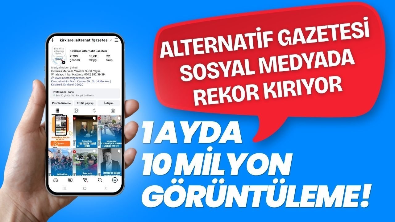 Sosyal medyada da Kırklareli’nin tercihi Alternatif Gazetesi oluyor. Kırklareli’nin nabzını tutan ve yerel medyanın güçlü sesi olan Alternatif Gazetesi, güzel bir başarıya imza attı. Yenilikçi yayıncılık anlayışı ve anlık haber paylaşımıyla gündemin nabzını tutan İnstagram hesabımız, son bir ay içerisinde 10 milyon görüntüleme barajını aşarak erişilmesi güç bir istatistiğe ulaştı.