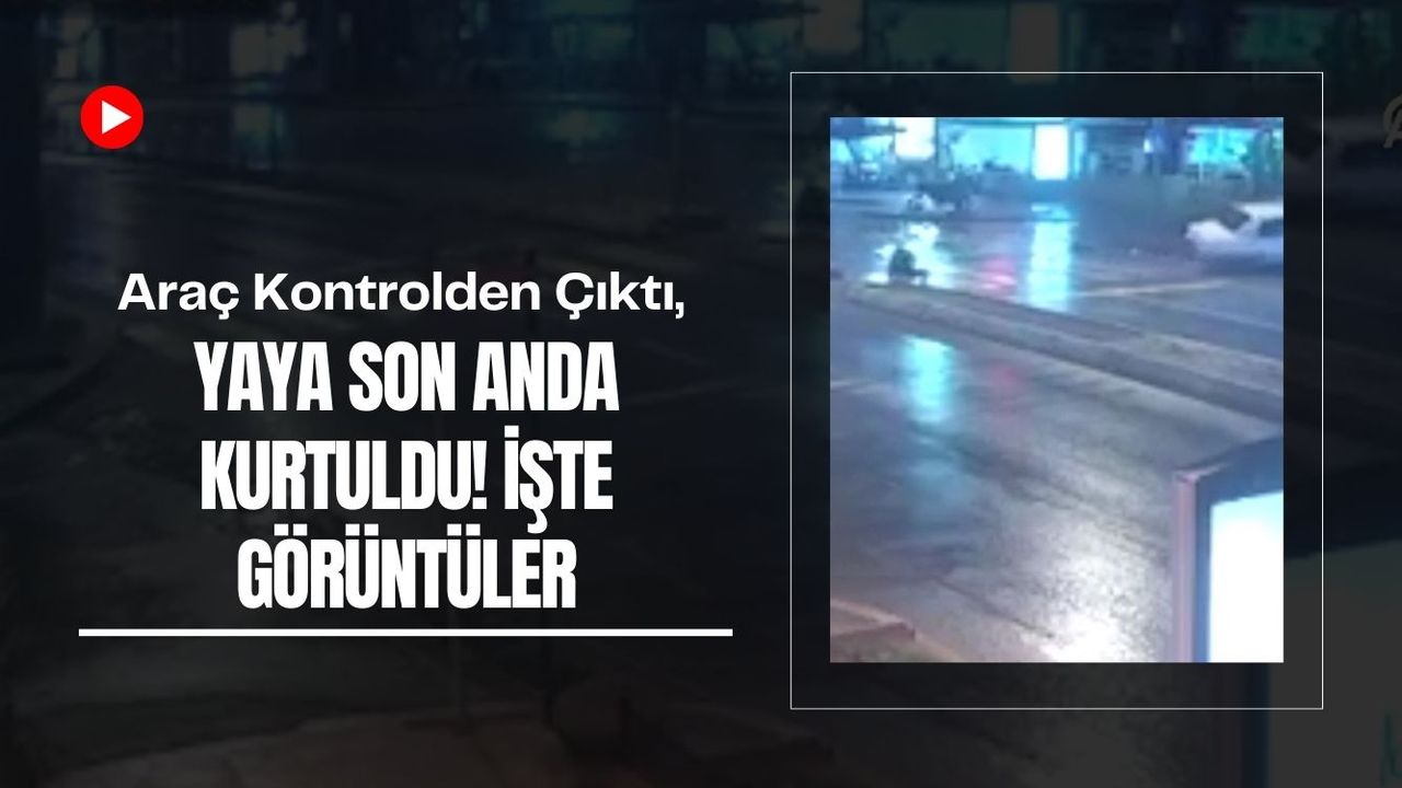 Görüntülerde otomobilin refüje çarpıp karşı şeride geçtiği, bu sırada yaya geçidinde bekleyen kişinin üzerine gelen araçtan korunmak için yere yattığı anlar yer alıyor.
