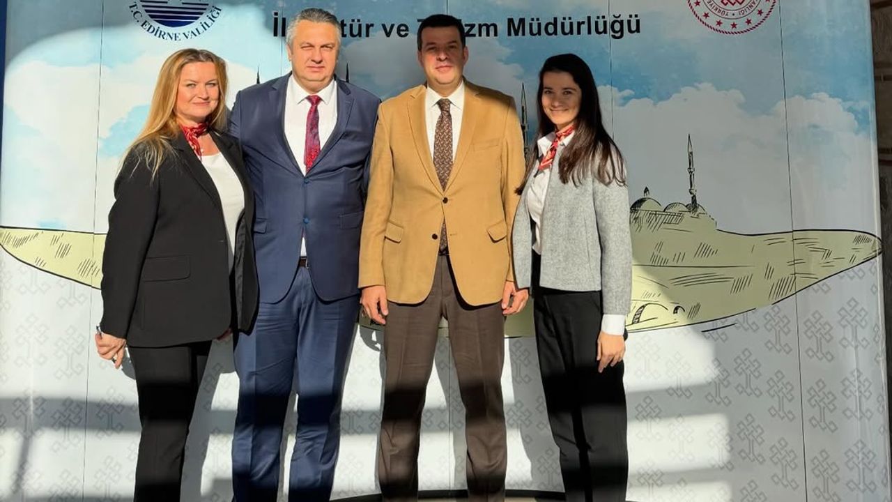 Ok Kumaşcılık işletme sahipleri Çoşkun Aslan, Saffet Aslan ve tasarımcı Merve Selvi Baran, Edirne Turizm ve Kültür Müdürü Kemal Soytürk'ü ziyaret etti.
