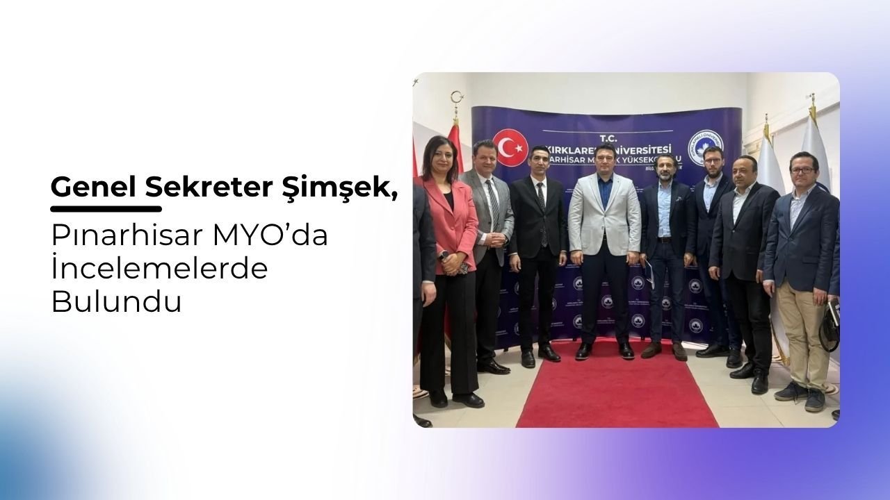 Pınarhisar Meslek Yüksekokulu’nda incelemeler gerçekleştiren KLÜ Genel Sekreteri Ahmet Şimşek’e; Kalite ve Akreditasyon Koordinatörü Dr. Öğr. Üyesi Alaettin İşeri, Sürdürülebilirlik Koordinatörü Dr. Öğr. Üyesi Engin Kabataş, İdari ve Mali İşler Daire Başkanı Cüneyt Koca, Bilgi İşlem Daire Başkanı Durmuş Yenici, Sağlık Kültür ve Spor Daire Başkanı Yasemin Gür ile Yapı İşleri ve Teknik Daire Başkanı Yunus Koç eşlik etti.