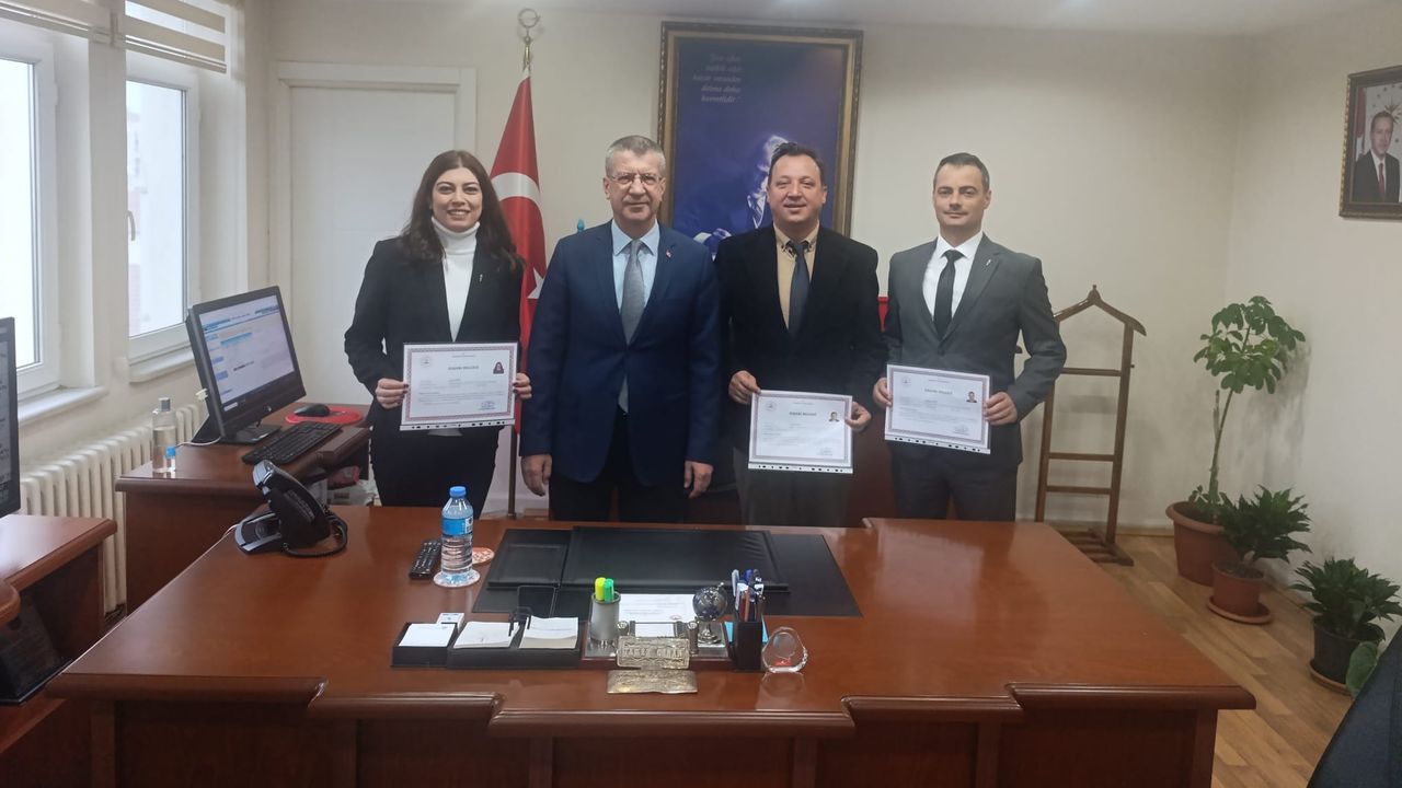 Kaymakam Tamer Orhan, İlçe Tarım ve Orman Müdürlüğü, İlçe Sosyal Hizmet Merkezi Müdürlüğü ve İlçe Müftülüğü’nde müdür ve çeşitli unvanlarda görev yapmakta olan personellerini görevlerini yürütürken göstermiş oldukları azim, gayret ve üstün başarılarından dolayı başarı belgesi ile ödüllendirdi. Belge töreni için müdür ve diğer personelleri makamında kabul eden Kaymakam Orhan “Görevinizde göstermiş olduğunuz üstün gayretlerinizden dolayı sizleri tebrik eder, başarılarınızın bundan sonra da artarak devam edeceğine olan inancımı belirtmek isterim.” dedi.