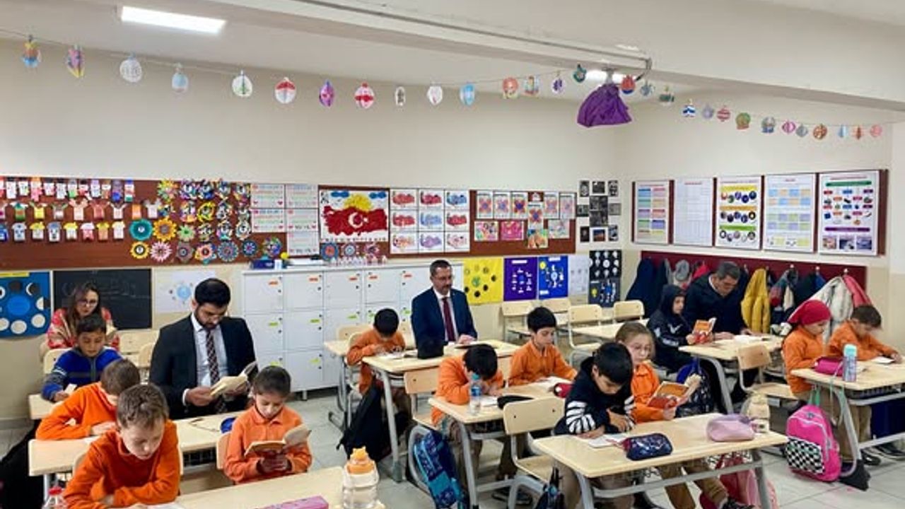 Kaymakam Özderin’e İlçe Milli Eğitim Müdürü Mahmut Doğan da eşlik etti. İkili kitaplarını alarak öğrencilerin arasında oturdu ve kitap okudu.