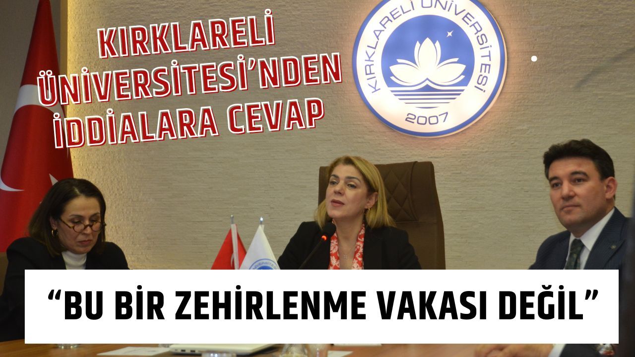 Kırklareli Üniversitesi Rektörlüğü Senato Toplantı Odasında gerçekleşen basın toplantısında “öğrenciler zehirlendi” iddialarına yanıt verildi. Rektör Prof. Dr. Rengin Ak ve Genel Sekreter Ahmet Şimşek yaptıkları açıklamalarda bu durumun literatüre göre bir zehirlenme vakası olmadığını vurguladılar.