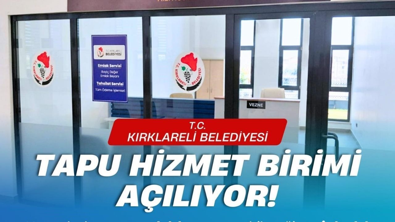 Bu kapsamda Kırklareli Belediyesi, Tapu Hizmet Birimi açılıyor. Vatandaşların emlak beyanı verebileceği, rayiç bedel belgelerini temin edebileceği ve tüm tahsilat işlemlerini gerçekleştirebileceği belediye hizmet birimi, Kırklareli Tapu Müdürlüğü binasında 10 Mart 2026 tarihi itibari ile hizmet vermeye başlayacak.
