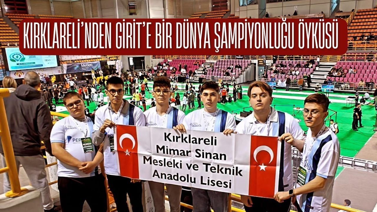 Kırklareli’nin başarılı öğrencileri bir ilke daha imza attı. Kırklareli Mesleki ve Teknik Anadolu Lisesi öğrencileri Can Ayar, İbrahim Efe Direk, İlhan Mete Mankır, Efe Demiöz, Utku Bulu ile Efe Kırtay 55 ülkede 4 kıtadan 3 bin 648 katılımcı ile 1466 robotun mücadele ettiği Girit Robot Olimpiyatlarında Wrestling Mini Senior kategorisinde dünya birinciliğini elde ettiler.