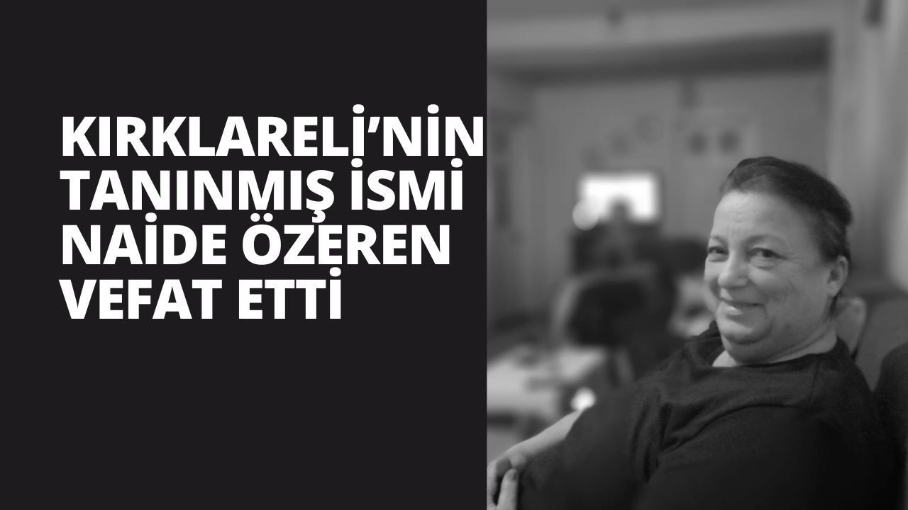 İstasyon Mahallesi sakinlerinden, Okan Özeren’in annesi, Kırklareli Öğretmenevinden Emekli Naide Özeren vefat etti. Merhumenin cenaze namazı öğle namazına müteakiben Büyük Camiİ'nde kılınacak.