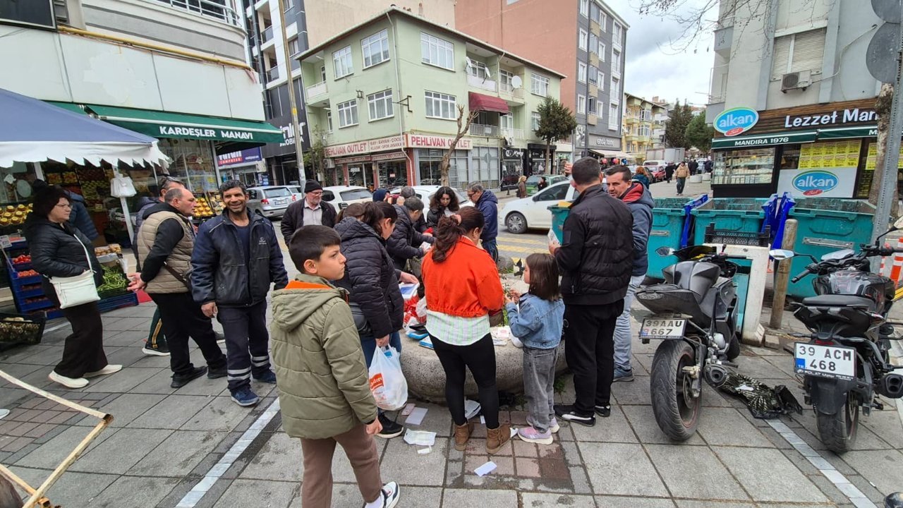 Kaldırım kenarında bulunan dinlenme bantlarının üzerine poşet poşet koyulan kılıfların çevresini kısa sürede kalabalık sardı.