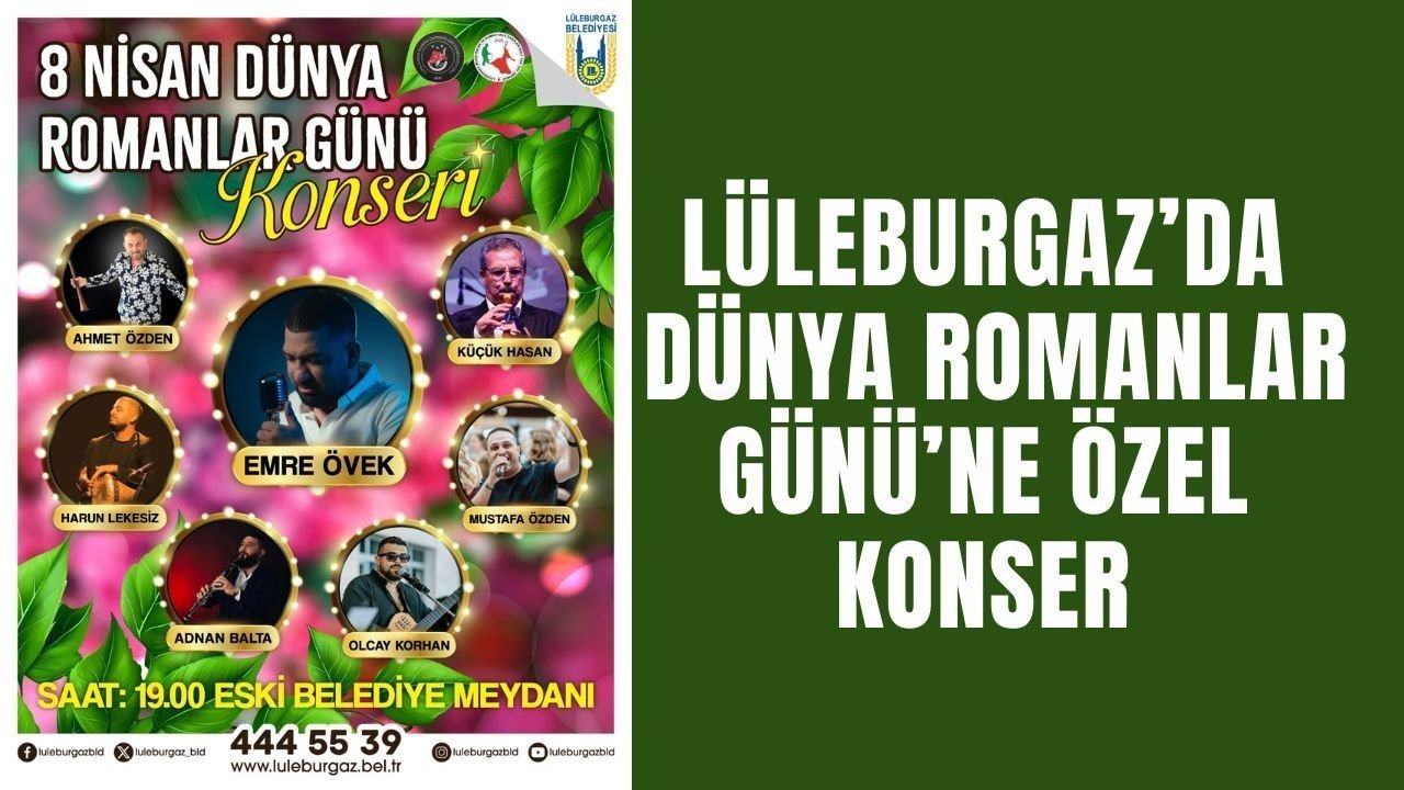 Lüleburgaz Belediyesi’nin düzenleyeceği etkinlik kapsamında, Lüleburgaz’ın yetiştirdiği usta sanatçılar 8 Nisan Dünya Romanlar Günü’nde sahne alacak. Çarşamba akşamı eski Belediye Meydanı’nda halka açık gerçekleştirilecek konserde Ahmet Özden, Küçük Hasan, Emre Övek, Harun Lekesiz, Mustafa Özden, Adnan Balta ve Olcay Korhan sahnede olacak. Roman kültürünün zenginliğinin ve müziğin birleştirici gücünün ön planda olacağı konser saat 19:00’da başlayacak.