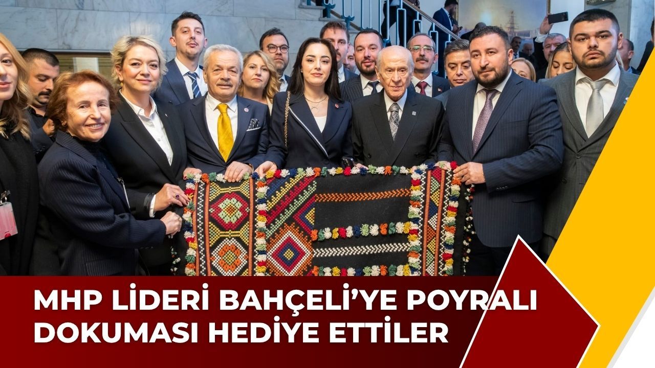 Ziyarette MHP lideri Devlet Bahçeli’ye, Kırklarelili hanımların el emeği olan Coğrafi İşeretli Poyralı dokuma seccade hediye edildi.